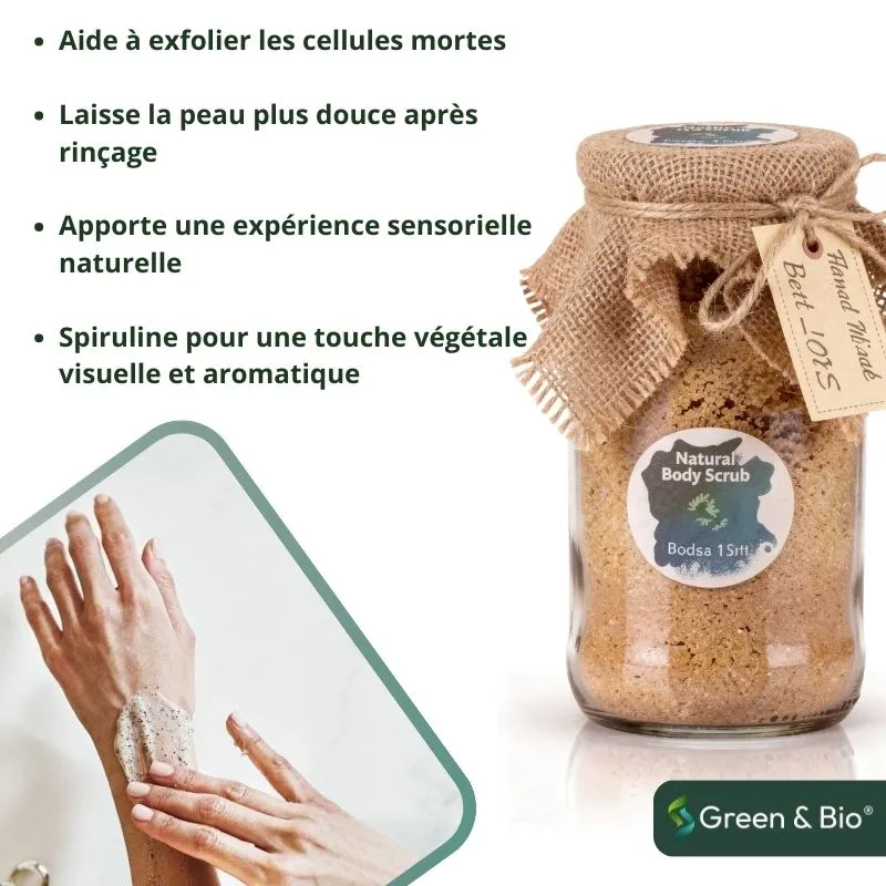 Gommage corporel naturel à base de particules exfoliantes et de spiruline, conçu pour adoucir la peau et offrir une sensation de fraîcheur après utilisation.